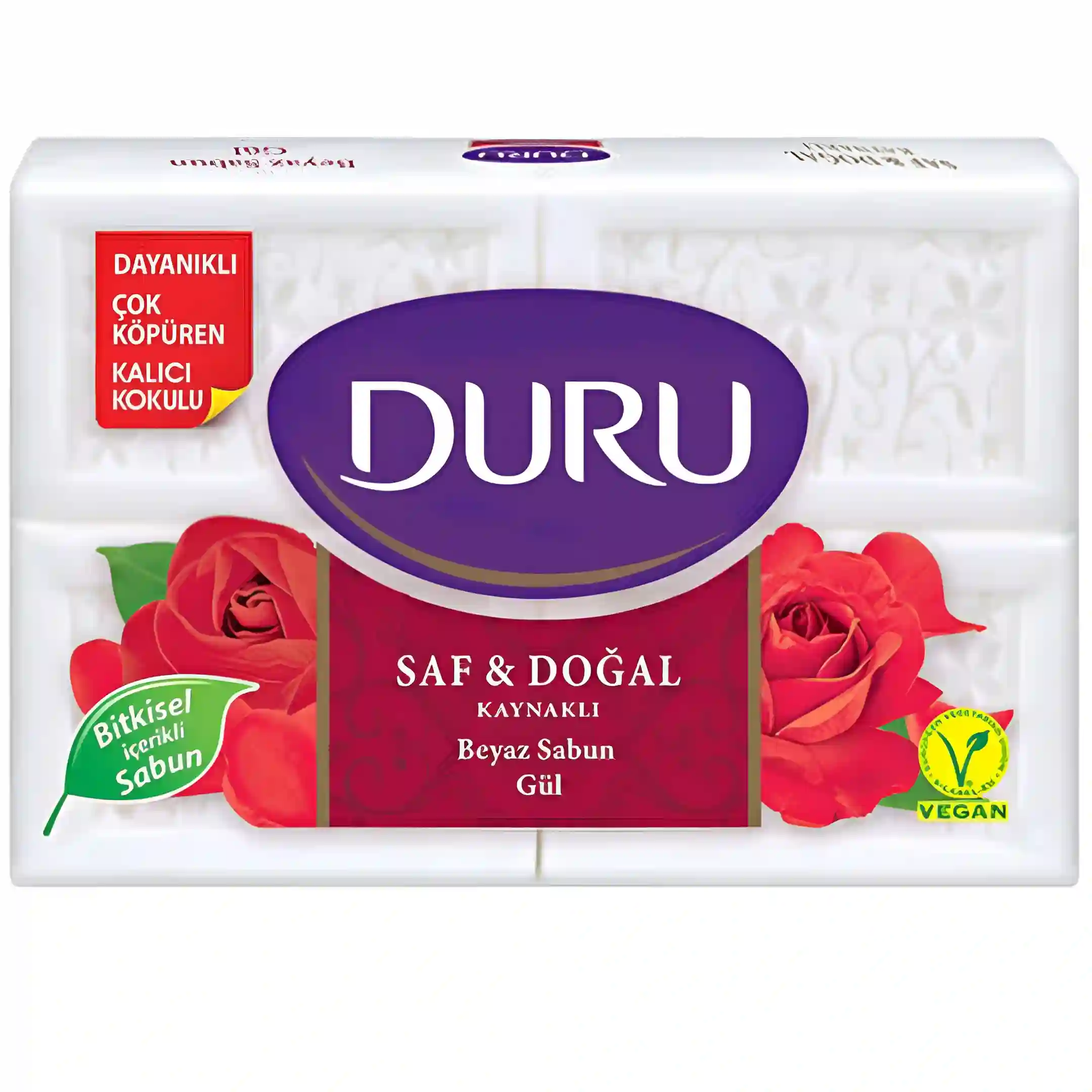 صابون Duru Saf & Doğal Gül با عصاره طبیعی گل رز، پوست را بهصورت ملایم پاک کرده و لطافت و شادابی را به آن بازمیگرداند