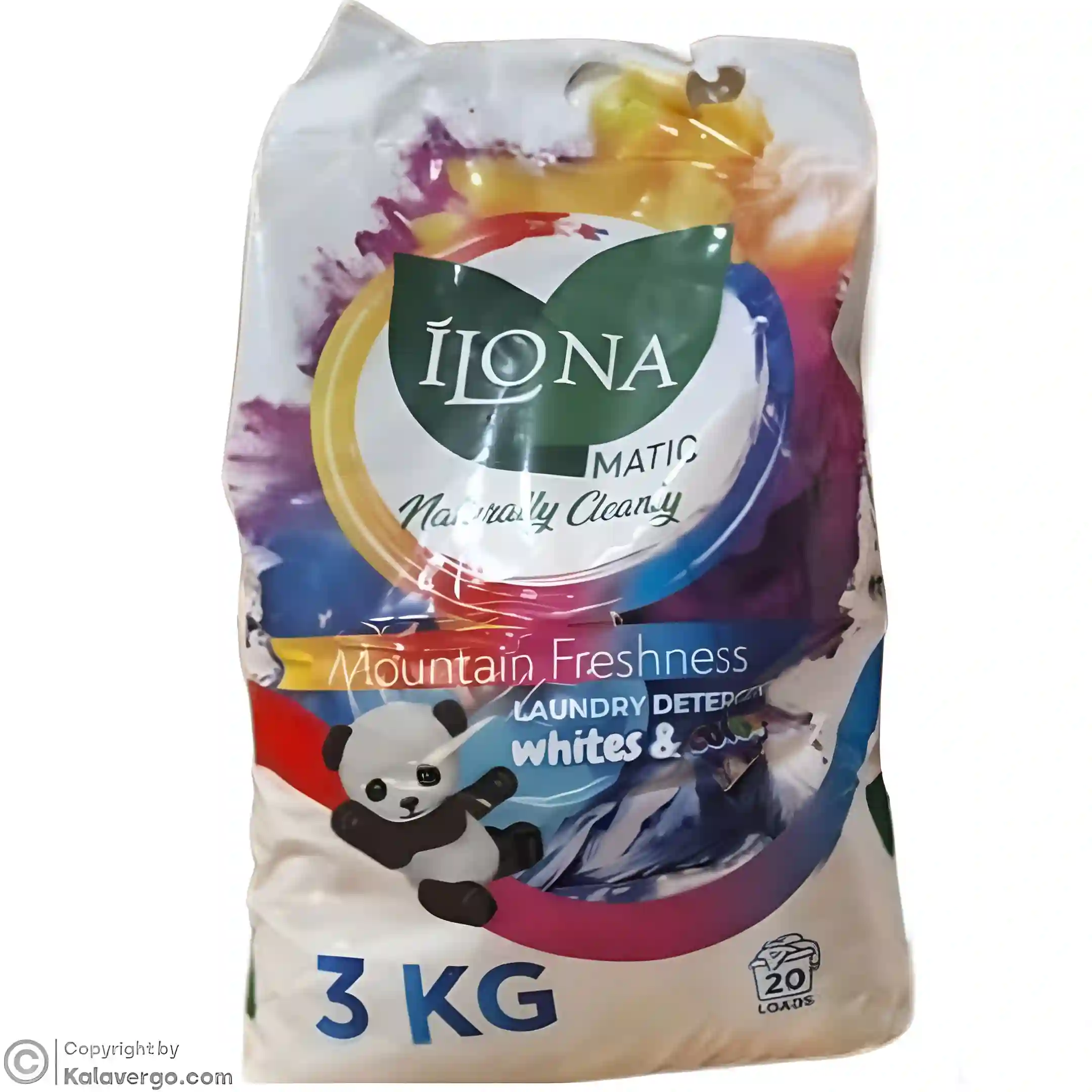 پودر ماشین لباسشویی ایلونا حاوی رایحه کوهستان Ilona مخصوص لباس های رنگی و سفید بسته 3 کیلویی